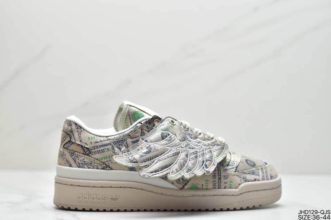 190 阿迪达斯adidas Forum Low JS 联名 米绿色满印纸钞翅膀低帮板鞋 GX6393
