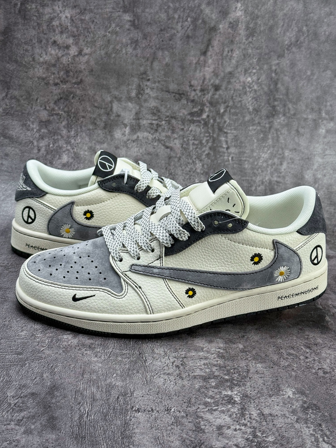 定制版Travis Scott x Jordan 1 Low “权志龙联名——雏菊米灰黑” 高端定制 乔丹倒勾低帮休闲板鞋 QW5088-208